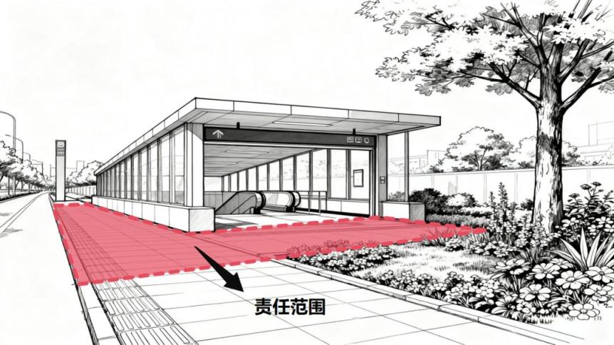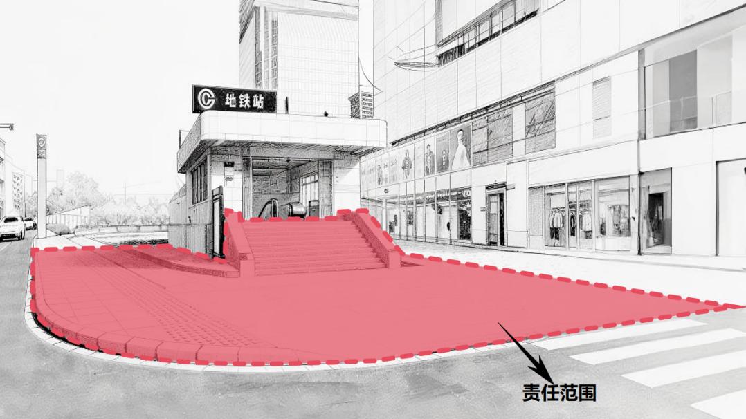 地铁站口有东谈主行谈,“门前三包”包袱范畴包括:轨谈交通收支口建筑物、构筑物外侧墙体向外延迟至东谈主行谈路缘石区域。